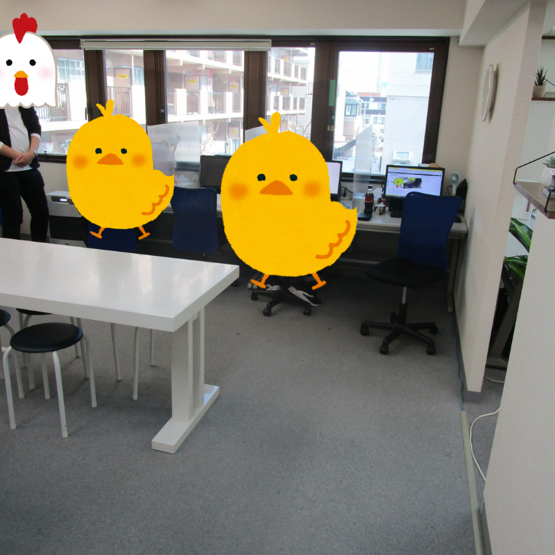 アクションのPC作業場所は入り口から見て奥にあり、パソコン8台がL字のような形に1辺4台ずつ並んでいます。