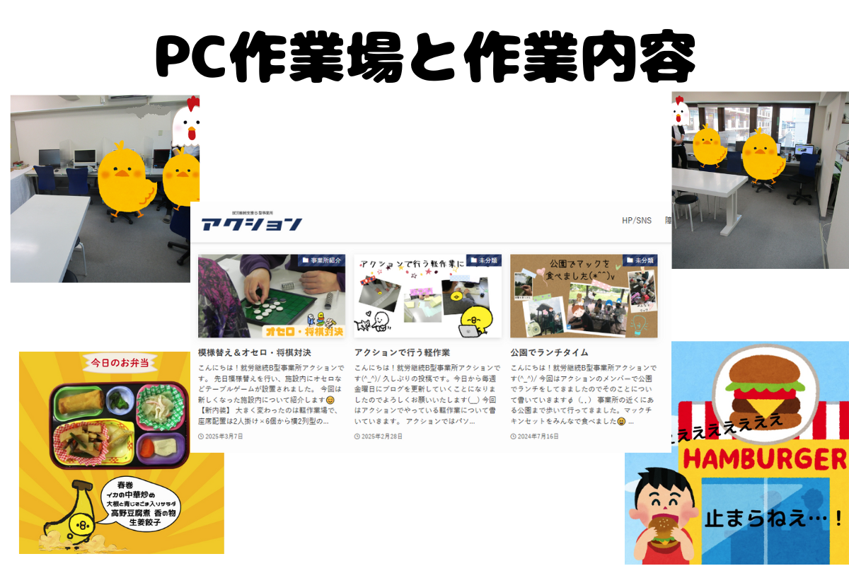 今回はアクションのPC作業場と作業内容について書いていきたいと思います。