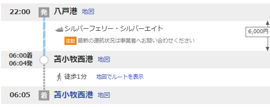 シルバーフェリーの2等が6,000円しますが、インターネットで事前購入しますと10%オフ(5,400円)で購入できますので、事前購入をお願いします