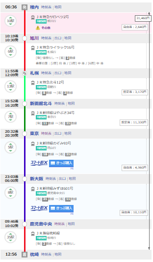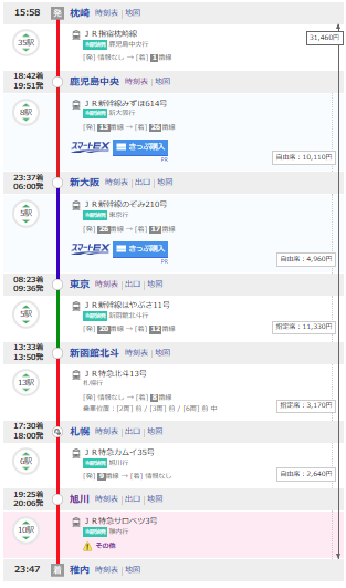 稚内 → 枕崎 割引無しで 合計 63,670円 ×2 = 127,340円