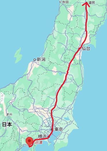 沼津→熱海→宇都宮→黒磯→新白河→郡山→福島→白石→仙台→小牛田→一ノ関→盛岡 JR