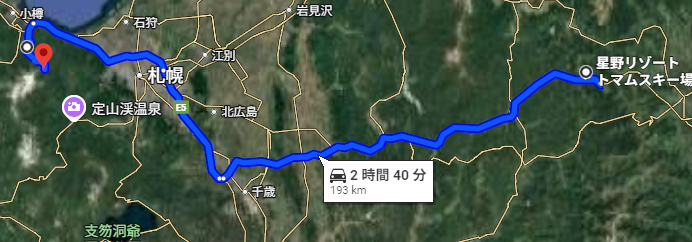 大まかなルートは新千歳空港→トマム→札幌国際スキー場→定山渓(じょうざんけい)温泉→札幌観光→新千歳空港となります。