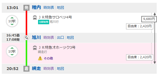 その後は旭川まで乗って頂き、乗り換えて特急オホーツクで網走まで景色を眺めながら進んでください