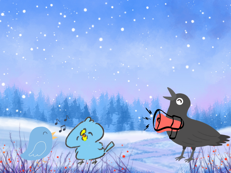 ユーモラスなカラスと、カラスの様子を楽しむ小鳥たちの姿に癒されます。