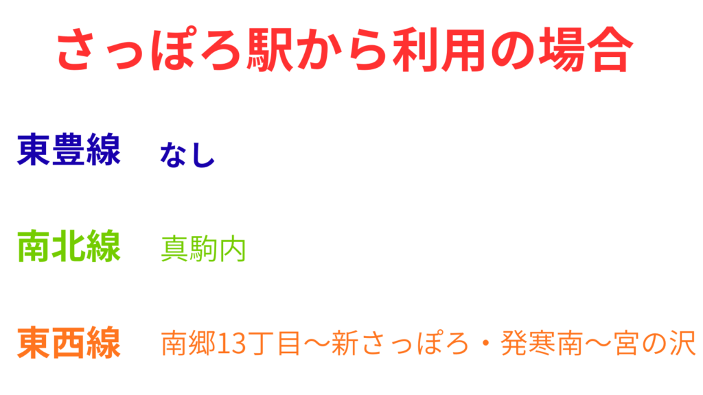 大通駅から往復の場合は南北線内では自衛隊前駅~真駒内駅間、東豊線は栄町駅、東西線は南郷18丁目駅~新さっぽろ駅間と宮の沢駅は『ドニチカ』の利用の方がお得になります。