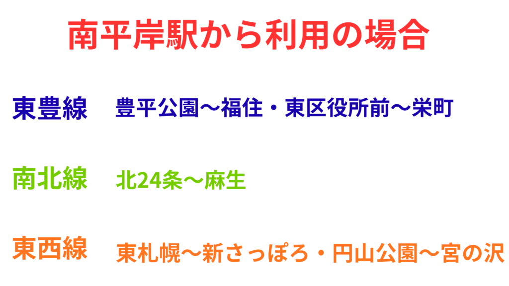 南平岸駅から往復の場合は南北線内では北24条駅~麻生駅間、東豊線は豊平公園駅~福住駅間と東区役所前駅~栄町駅間、東西線は東札幌駅~新さっぽろ駅間と円山公園駅~宮の沢駅間は『ドニチカ』の利用の方がお得になります。