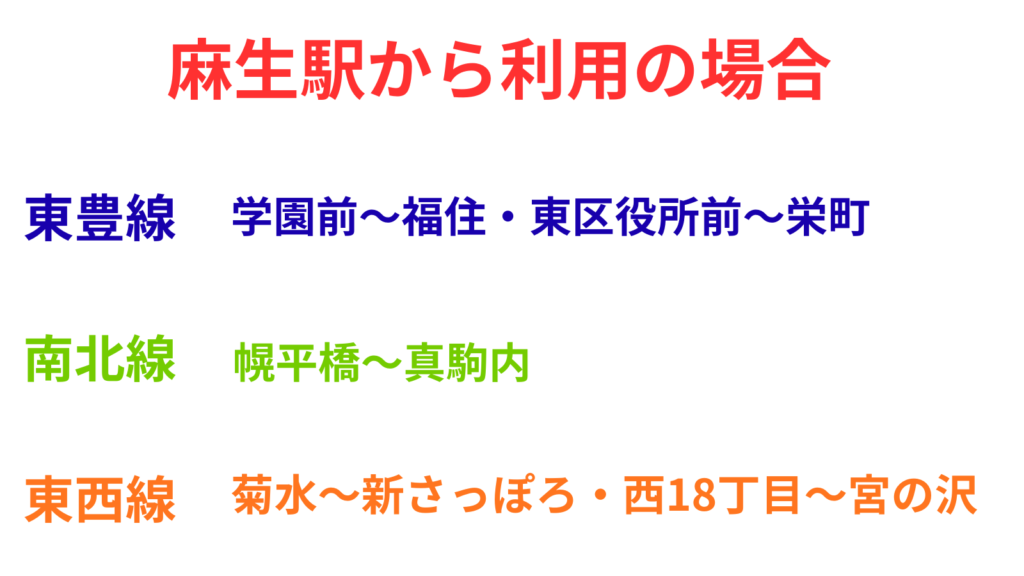 麻生駅から往復の場合は南北線内では幌平橋駅~真駒内駅間、東豊線は学園前駅~福住駅間と東区役所前駅~栄町駅間、東西線は菊水駅~新さっぽろ駅間と西18丁目駅~宮の沢駅間は『ドニチカ』の利用の方がお得になります。