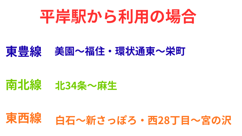 平岸駅から往復の場合は南北線内では北34条駅~麻生駅間、東豊線は美園駅~福住駅間と環状通東駅~栄町駅間、東西線は白石駅~新さっぽろ駅間と西28丁目駅~宮の沢駅間は『ドニチカ』の利用の方がお得になります。