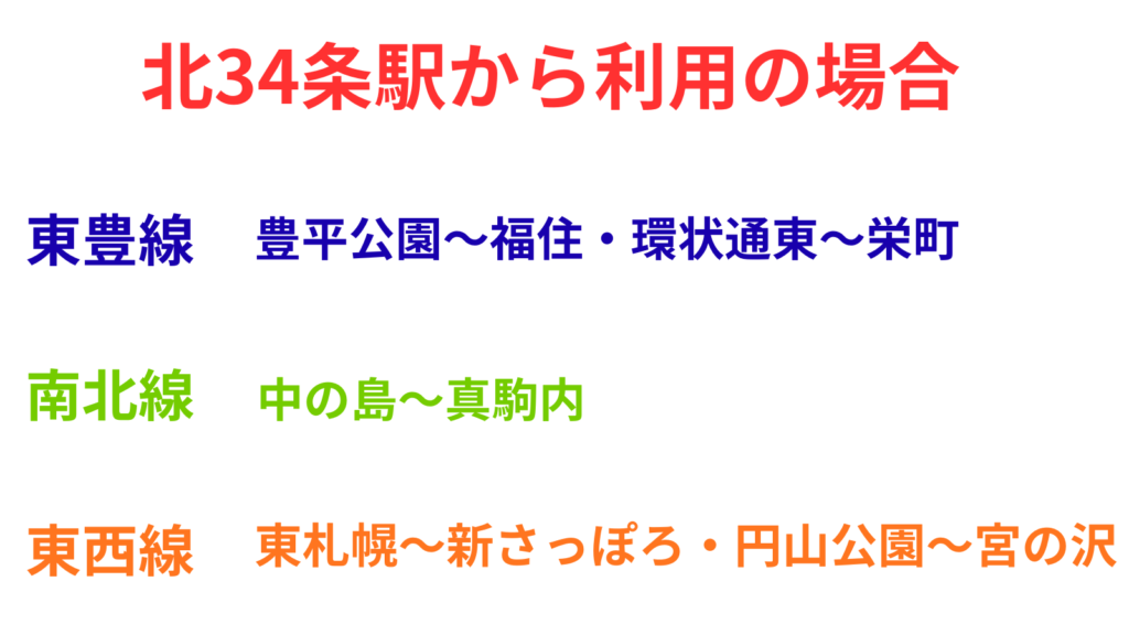 北34条駅から往復の場合は南北線内では中の島駅~真駒内駅間、東豊線は豊平公園駅~福住駅間と環状通東駅~栄町駅間、東西線は東札幌駅~新さっぽろ駅間と円山公園駅~宮の沢駅間は『ドニチカ』の利用の方がお得になります。