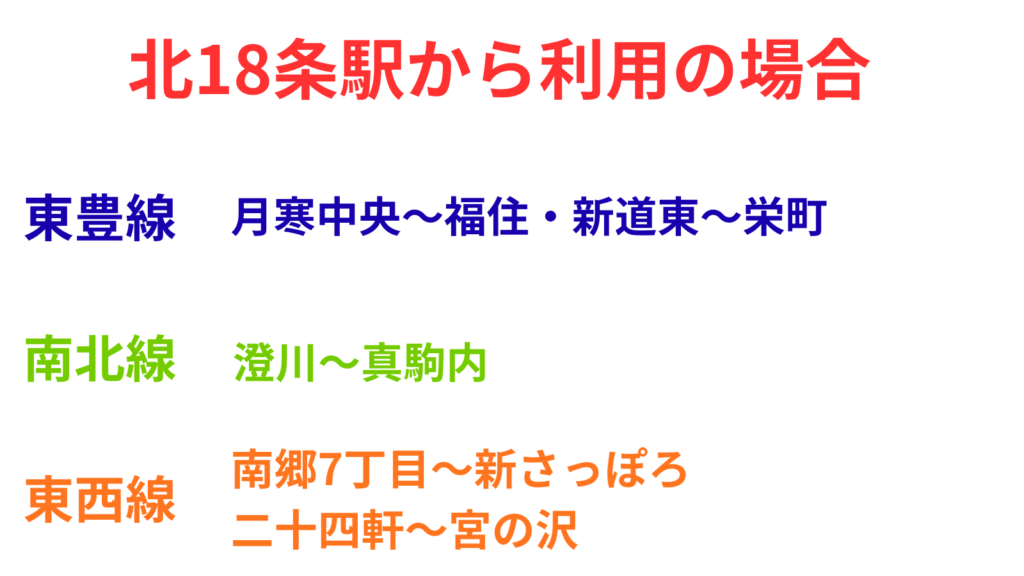 北18条駅から往復の場合は南北線内では澄川駅~真駒内駅間、東豊線は月寒中央駅~福住駅間と新道東駅~栄町駅間、東西線は南郷7丁目駅~新さっぽろ駅間と二十四軒駅~宮の沢駅間は『ドニチカ』の利用の方がお得になります。