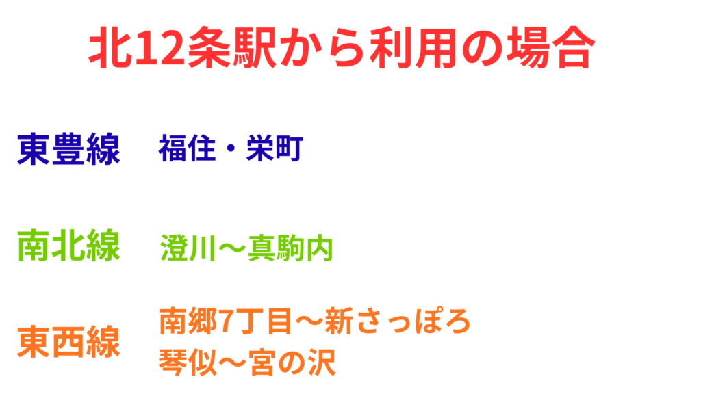 北12条駅から往復の場合は南北線内では澄川駅~真駒内駅間、東豊線は福住駅と栄町駅、東西線は南郷7丁目駅~新さっぽろ駅間と琴似駅~宮の沢駅間は『ドニチカ』の利用の方がお得になります。