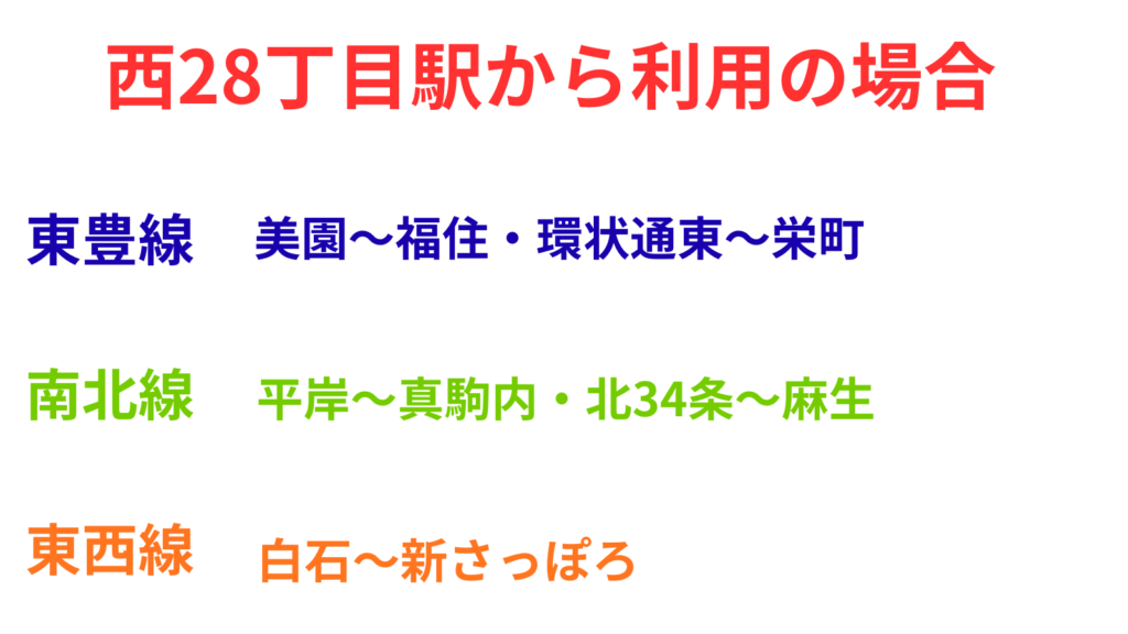 西28丁目駅から往復の場合は東西線内では白石駅~新さっぽろ駅間、東豊線は美園駅~福住駅間と新道東駅~栄町駅間、南北線は北34条~麻生駅間と平岸駅~真駒内駅間は『ドニチカ』の利用の方がお得になります。