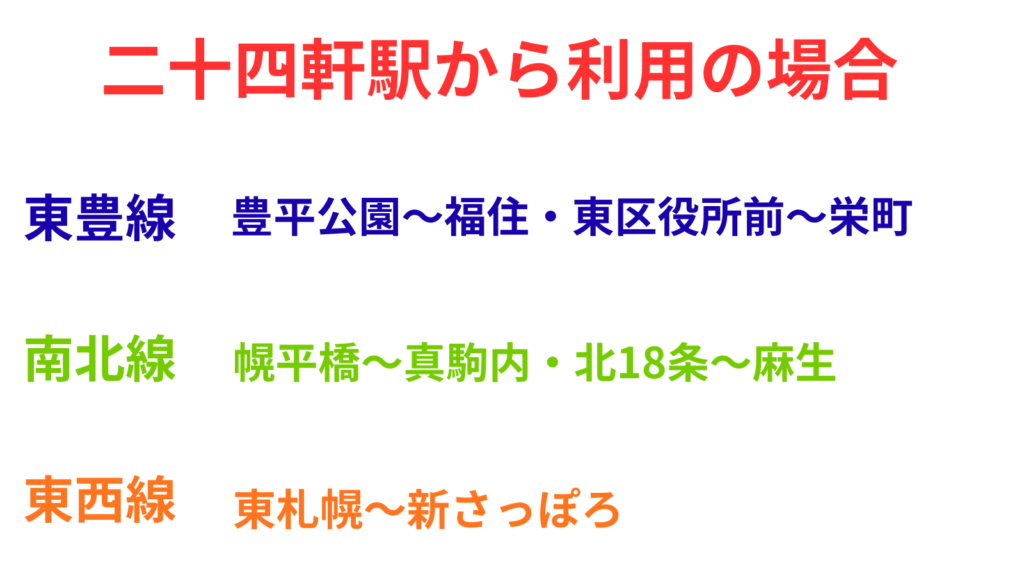 二十四軒駅から往復の場合は東西線内では東札幌駅~新さっぽろ駅間、東豊線は豊平公園駅~福住駅間と東区役所前駅~栄町駅間、南北線は北18条~麻生駅間と幌平橋駅~真駒内駅間は『ドニチカ』の利用の方がお得になります。