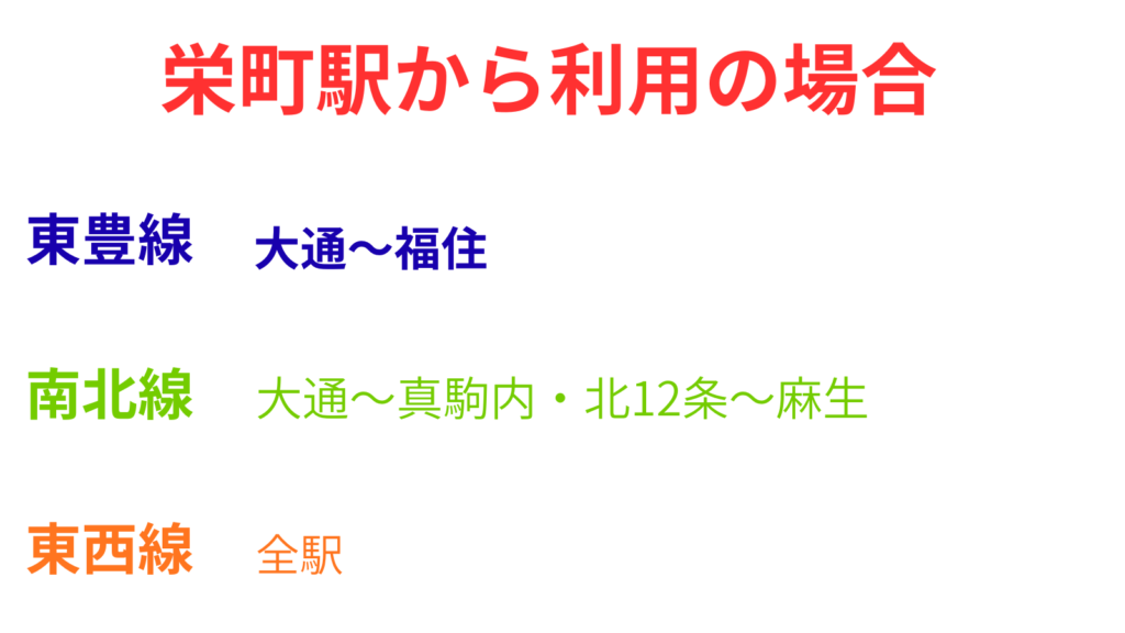 栄町駅から往復の場合は東豊線内では大通駅~福住駅間、南北線は北12条駅~麻生駅間と大通駅~真駒内駅間、東西線は全駅が『ドニチカ』の利用の方がお得になります。