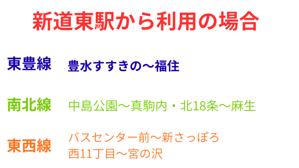 新道東駅から往復の場合は東豊線内では豊水すすきの駅~福住駅間、南北線は北18条駅~麻生駅間と中島公園駅~真駒内駅間、東西線はバスセンター前駅~新さっぽろ駅間と西11丁目駅~宮の沢駅間は『ドニチカ』の利用の方がお得になります。