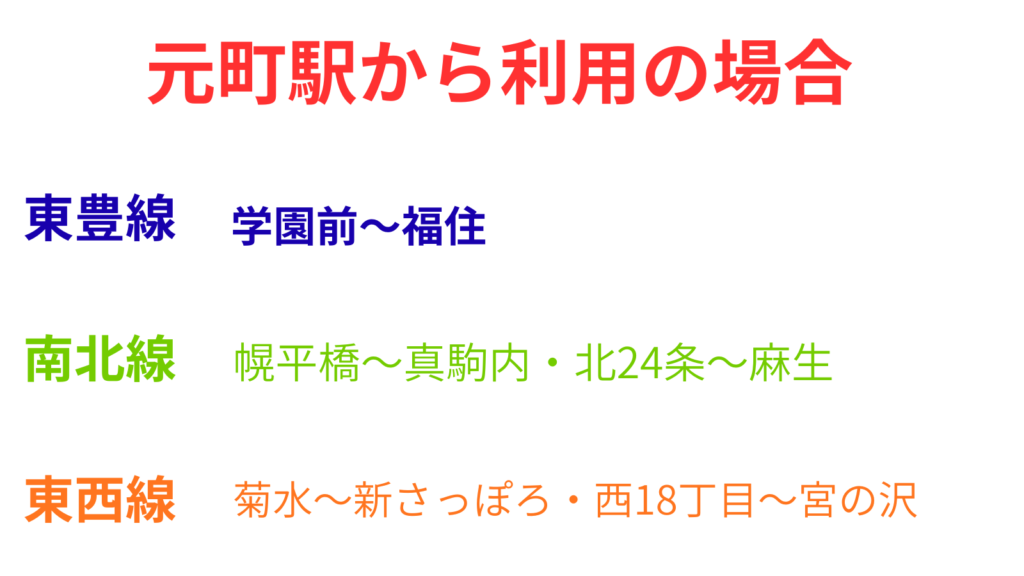 元町駅から往復の場合は東豊線内では学園前駅~福住駅間、南北線は北24条駅~麻生駅間と幌平橋駅~真駒内駅間、東西線は菊水駅~新さっぽろ駅間と西18丁目駅~宮の沢駅間は『ドニチカ』の利用の方がお得になります。