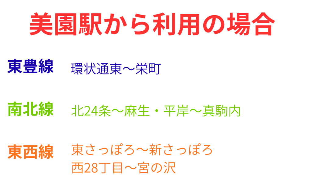 美園駅から往復の場合は東豊線内では環状通東駅~栄町駅間、南北線は北24条駅~麻生駅間と平岸駅~真駒内駅間、東西線は東さっぽろ駅~新さっぽろ駅間と西28丁目駅~宮の沢駅間は『ドニチカ』の利用の方がお得になります。