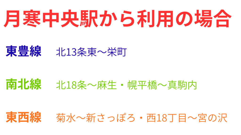 月寒中央駅から往復の場合は東豊線内では北13条東駅~栄町駅間、南北線は北18条駅~麻生駅間と幌平橋駅~真駒内駅間、東西線は菊水駅~新さっぽろ駅間と西18丁目駅~宮の沢駅間は『ドニチカ』の利用の方がお得になります。