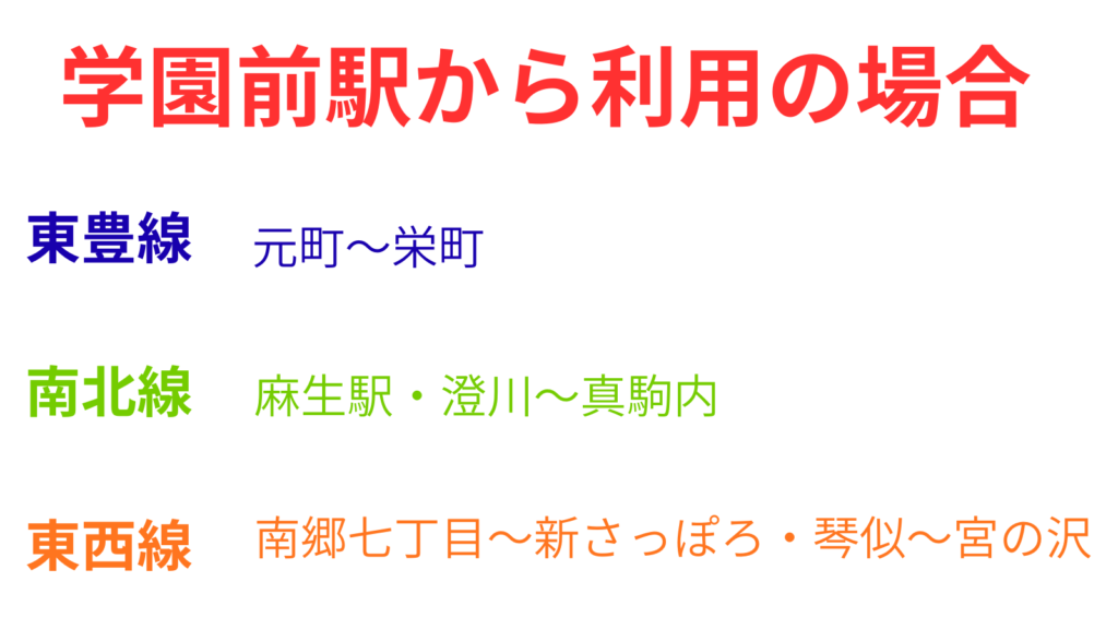 学園前駅から往復の場合は東豊線内では元町駅~栄町駅、南北線は麻生駅と澄川駅~真駒内駅間、東西線は南郷7丁目駅~新さっぽろ駅間と琴似駅~宮の沢駅間は『ドニチカ』の利用の方がお得になります。