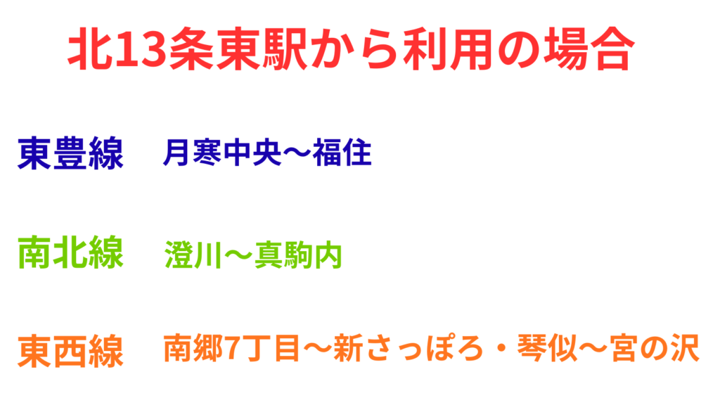 北13条東駅から往復の場合は東豊線内では月寒中央駅~福住駅間、南北線は澄川駅~真駒内駅間、東西線は南郷7丁目駅~新さっぽろ駅間と琴似駅~宮の沢駅間は『ドニチカ』の利用の方がお得になります。