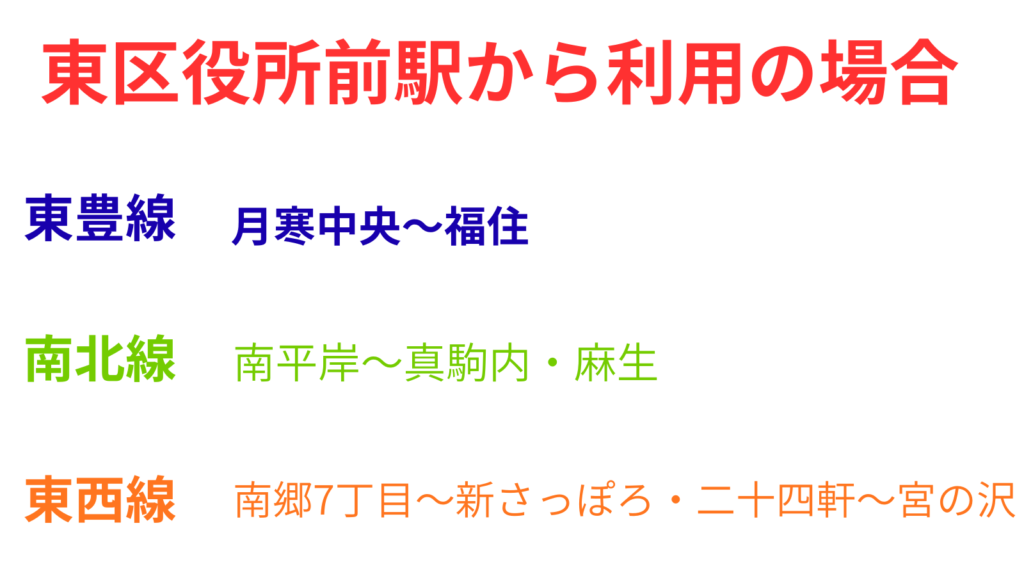東区役所前駅から往復の場合は東豊線内では月寒中央駅~福住駅間、南北線は麻生駅と南平岸駅~真駒内駅間、東西線は南郷7丁目駅~新さっぽろ駅間と二十四軒駅~宮の沢駅間は『ドニチカ』の利用の方がお得になります。