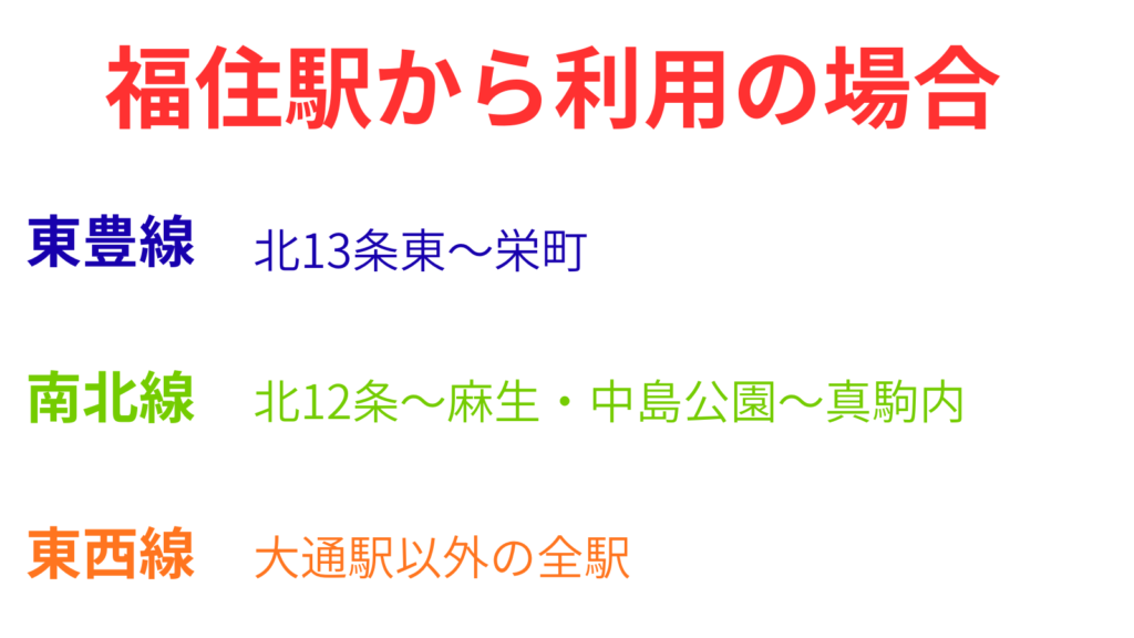 福住駅から往復の場合は東豊線内では北13条東駅~栄町駅間、南北線は北12条駅~麻生駅間と中島公園駅~真駒内間、東西線は大通駅以外の全駅は『ドニチカ』の利用の方がお得になります。